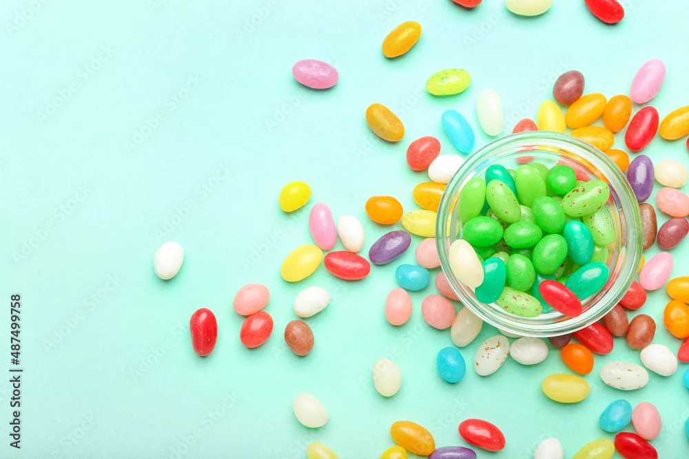 Bowl with different jelly beans on color background