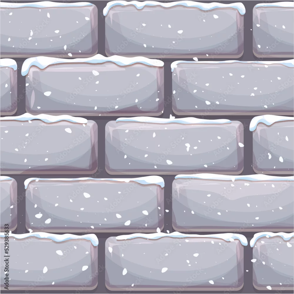 Brick wall with snow, stone bricks, rock surface in cartoon style, winter seamless background. Ui game asset, pavement or road. Textured and detailed.