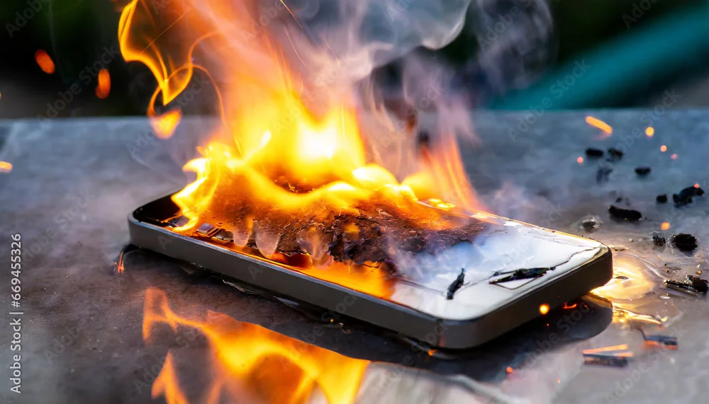 Burning smartphone exploding after overcharging battery with flames and smoke that destroy the melting smart phonewith flames and smoke that destroy the ...