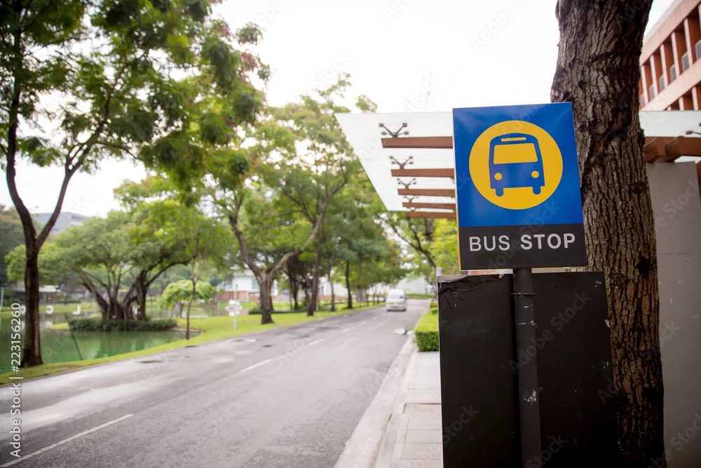 bus stop sign on bus station. public transportation and communication.. image for background, wallpaper and copy space. Reducing air pollution from cars ...