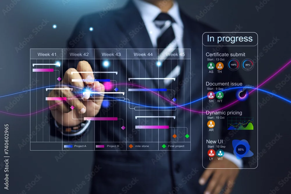 Businessman follow up progress of project work by using weekly gantt chart and graphic show the progress of team member on job status dashboard