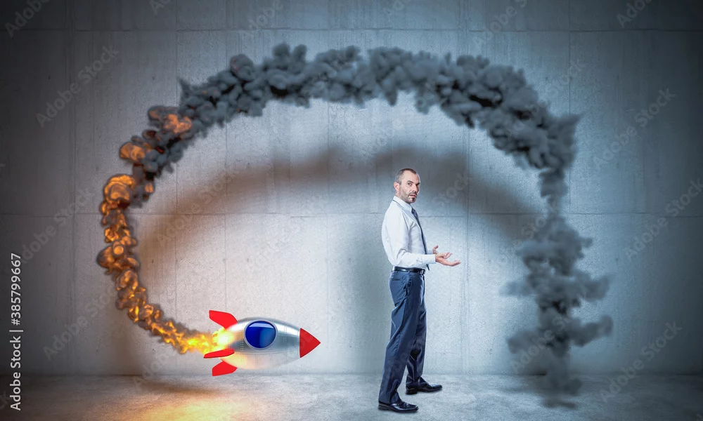 businessman launches a rocket but fails.