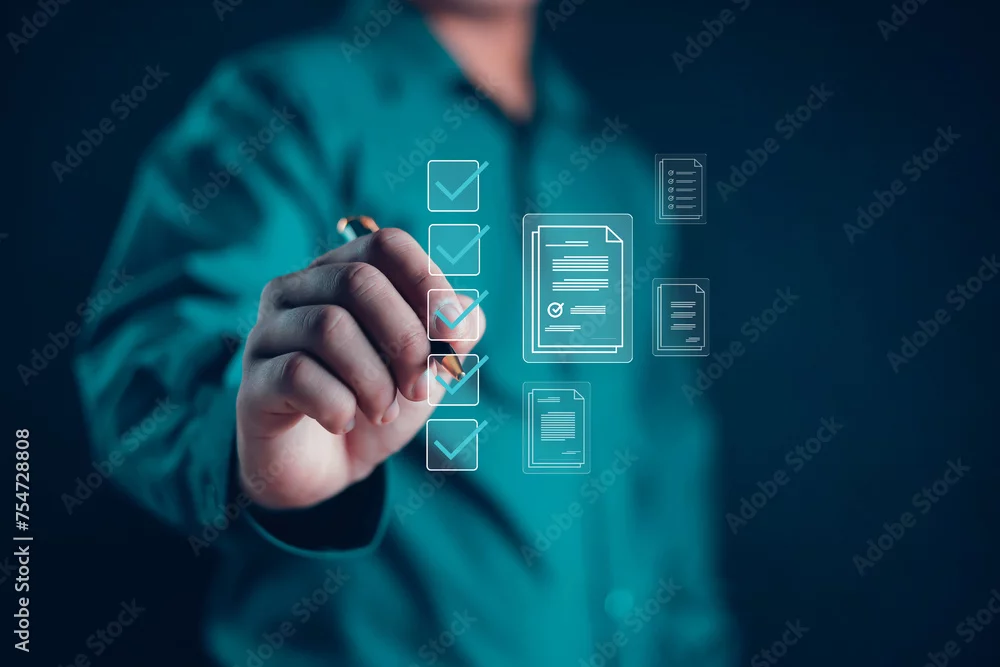 Businessman presents checklist and fills out online survey form document management system Assessment form, questionnaire, checklist and clipboard management ...