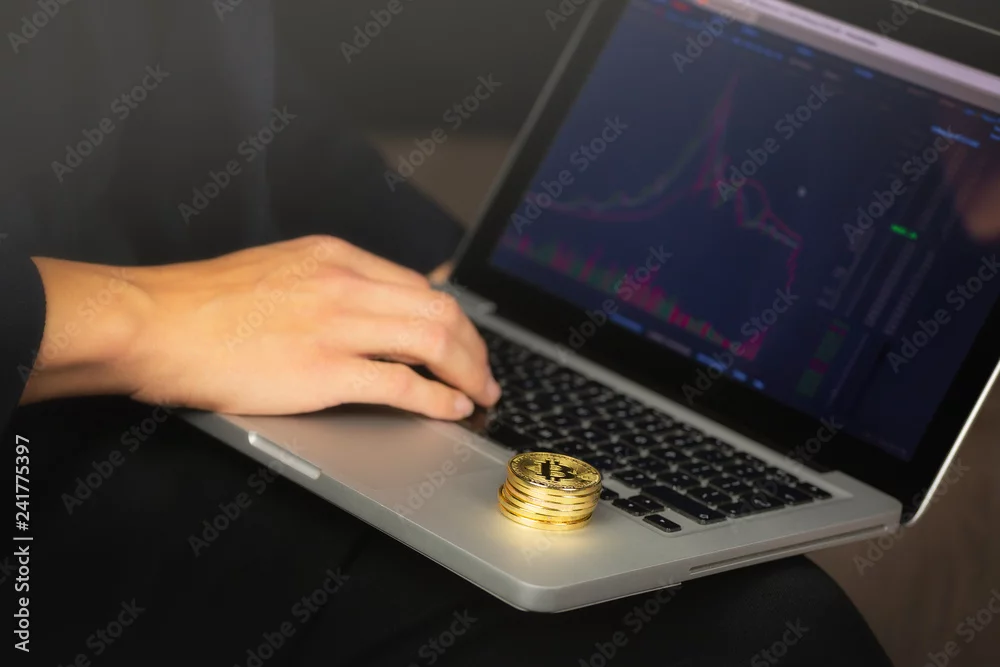 Businessman working on laptop with a golden bitcoin coins stack on it. Exchange chart on screen.
