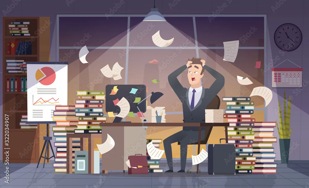 Busy businessman. Office manager hard work deadline stress chaos interior vector cartoon concept. Businessman busy, workplace office, employee chaos working illustration