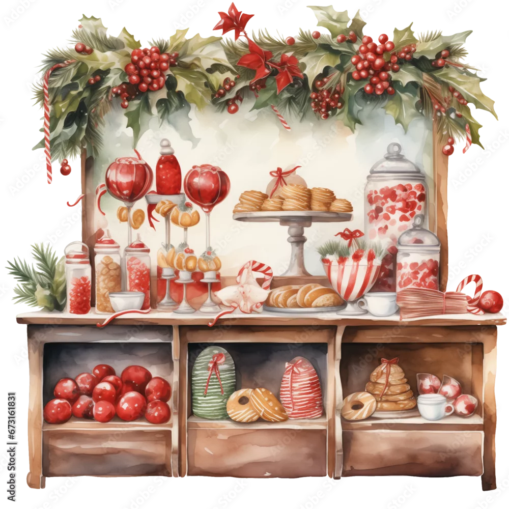 Candy stall Christmas market, Sweet shop watercolor illustration isolated with a transparent background, Holiday season Christmas candy store design
