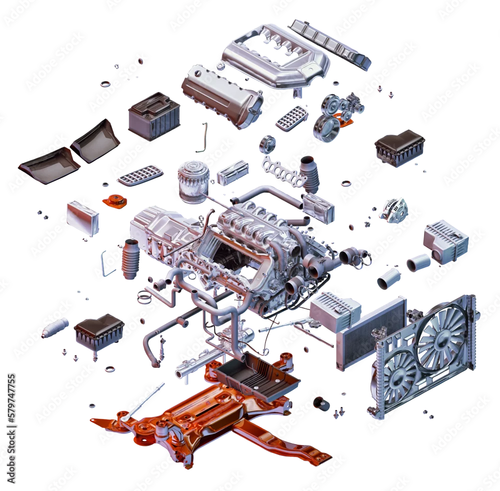 Car engine details isolated transparent background. Motor exploded view. Auto spare parts, machine engine assembly, automobile repair, vehicle service, ...