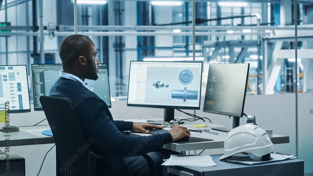 Car Factory Office: Black Engineer Working on Desktop Computer, Screens Show CAD Software with 3D Component, Monitoring of Automated Robot Arm Assembly ...