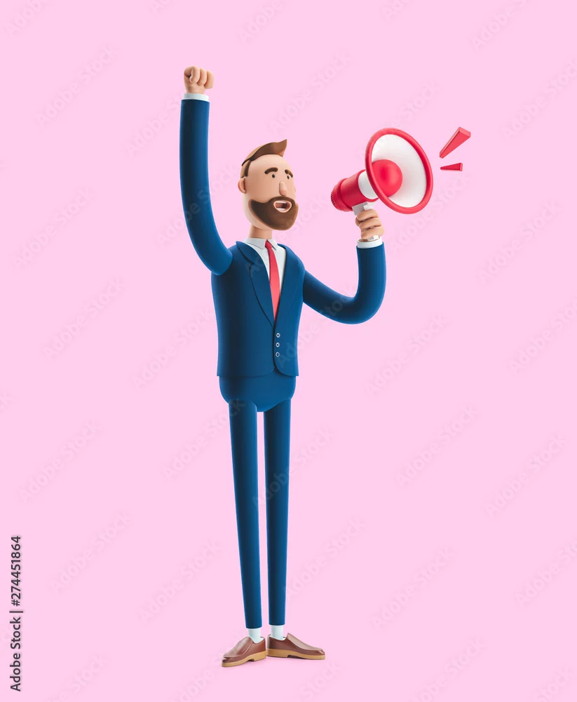 Cartoon character Billy shouting through loud speaker. 3d illustration on pink background