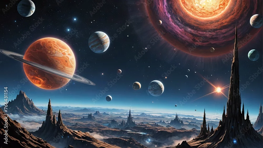 Cartoon solar system with bright planets on a dark cosmic background, including Earth with Saturn and Mars. Concept: astronomy and space