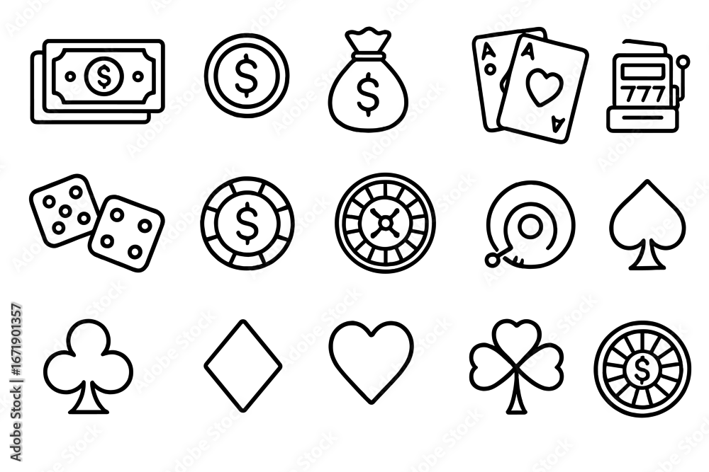 Casino and finance line icon set. Gambling and money linear pictograms. Vector symbols collection of betting, poker, slot machine, roulette, dice, cards, jackpot and wealth.