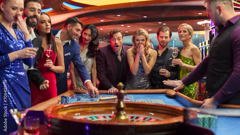 Casino Players Making Bets at a Roulette Table. Vibrant Crowd of International Young People Enjoying Nightlife in a City. Gamblers Excited About Successful Bets and Winning a Big Sum of Money