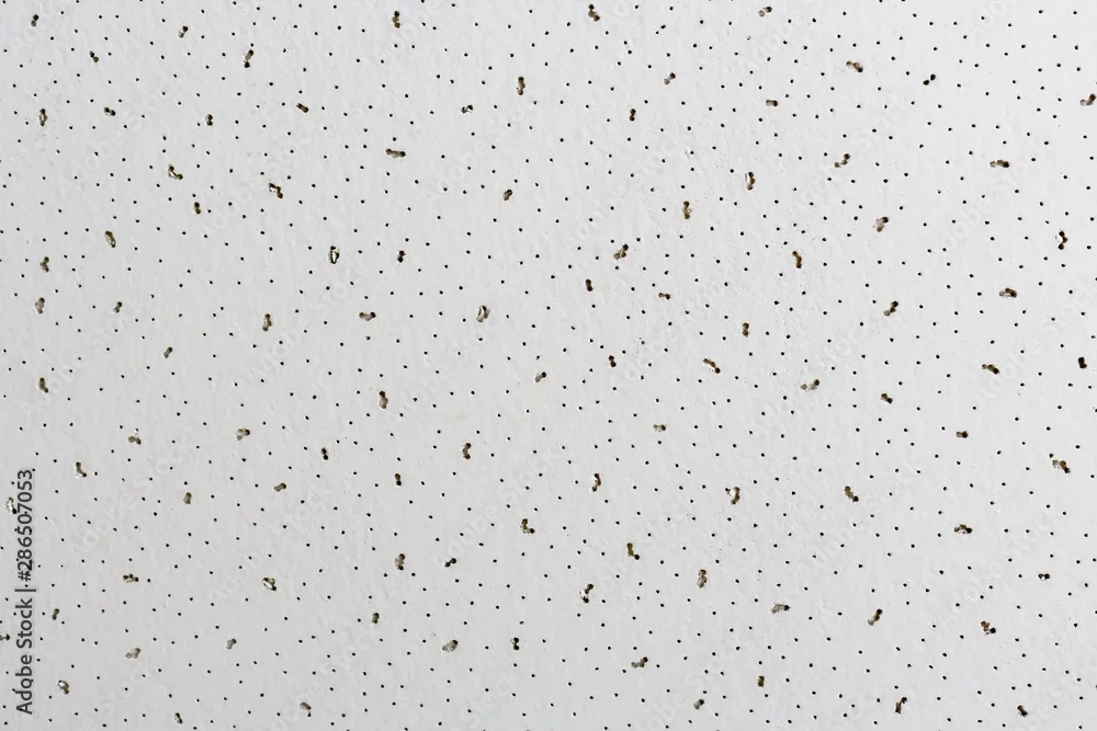 Ceiling tile surface closeup. Abstract white background with black dots.