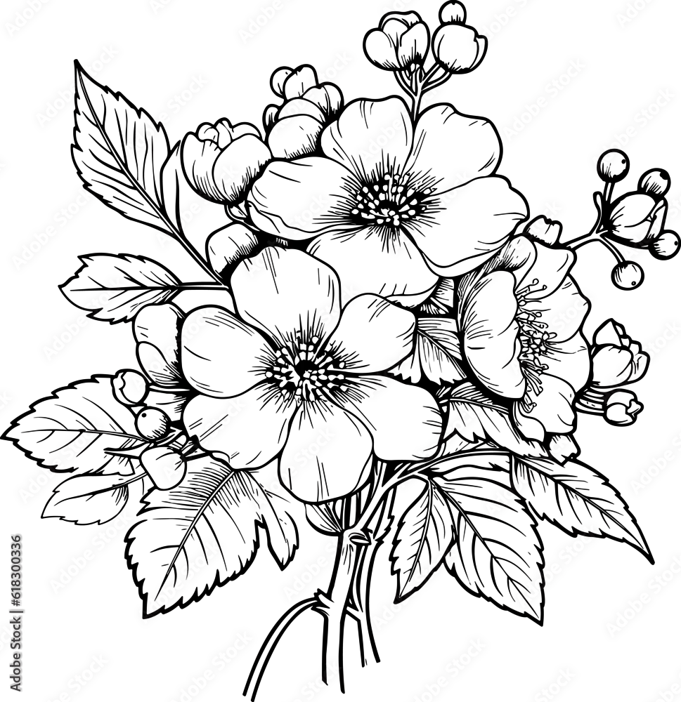 Cherry flower blossom, botanical art. Spring almond, sakura, apple tree branch, hand draw doodle vector illustration. Cute black ink art, isolated on white ...