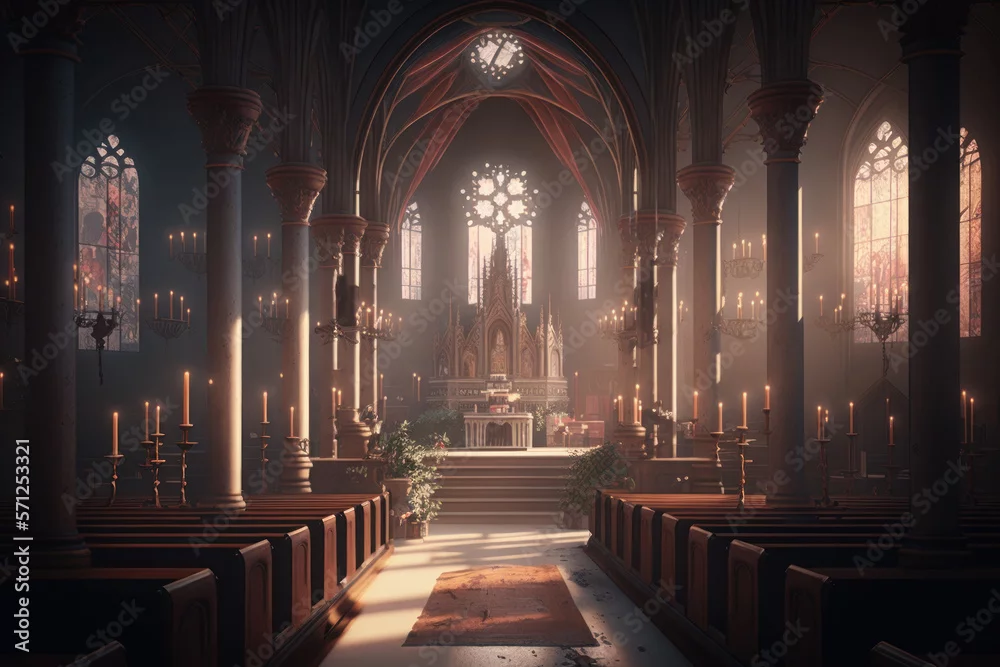christian church interior with altar and light entering on windows. generative ai