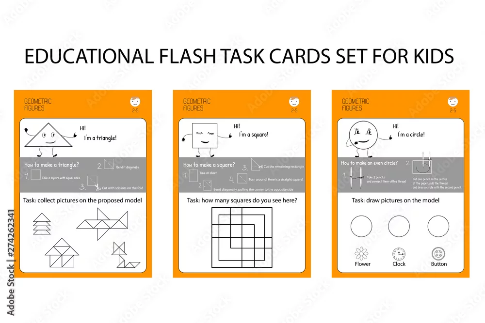 Circle, square, triangle. Educational cards for study of geometric shapes. game of drawing, math, modeling for preschoolers. For kindergartens and children's ...