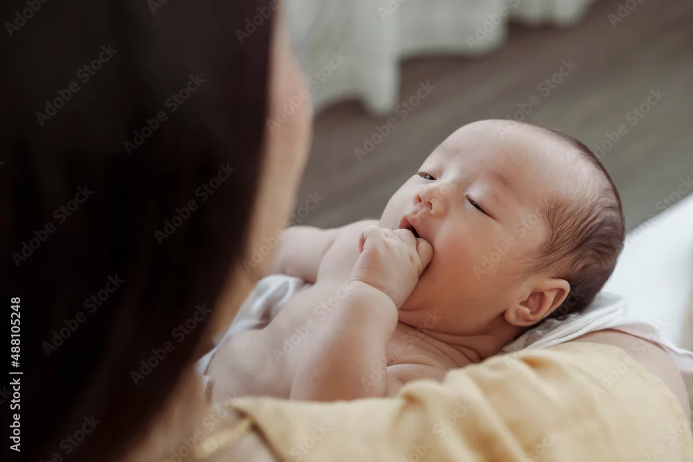 Close-up of a 2-month-old Asian newborn boy, undressed on his mother's lap. There is a mother who takes care of closely
