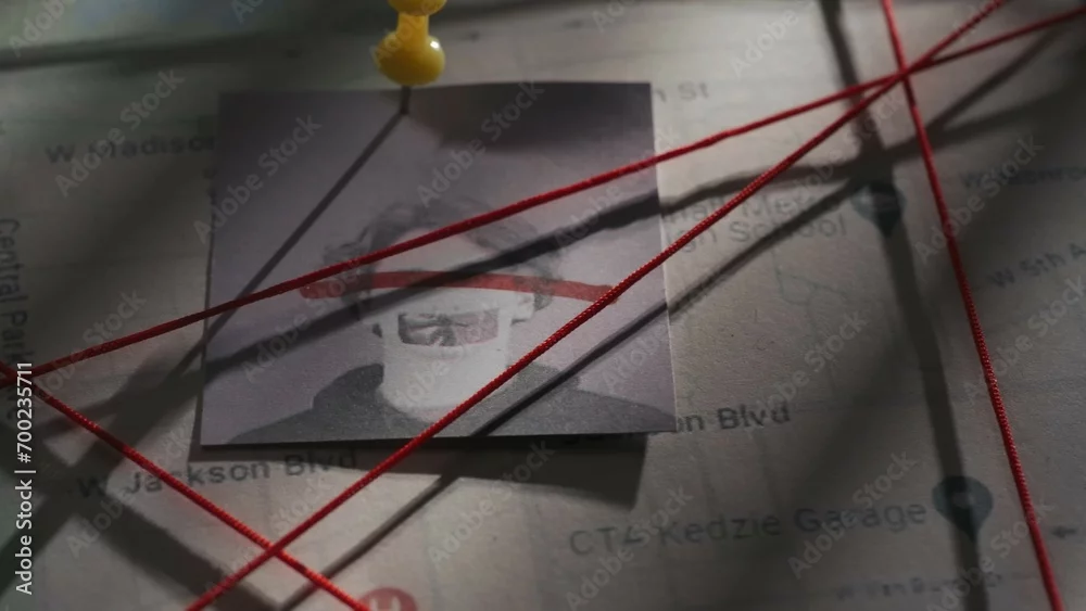 Close up shot of investigation board. Detective board with map of crime scene, pinned note with man face and red thread connecting clue proofs.