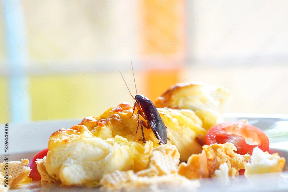 Cockroach are eating food on a plate in the kitchen. It's makes them dirty and poor hygiene in the house. Cockroaches are carriers of the disease.