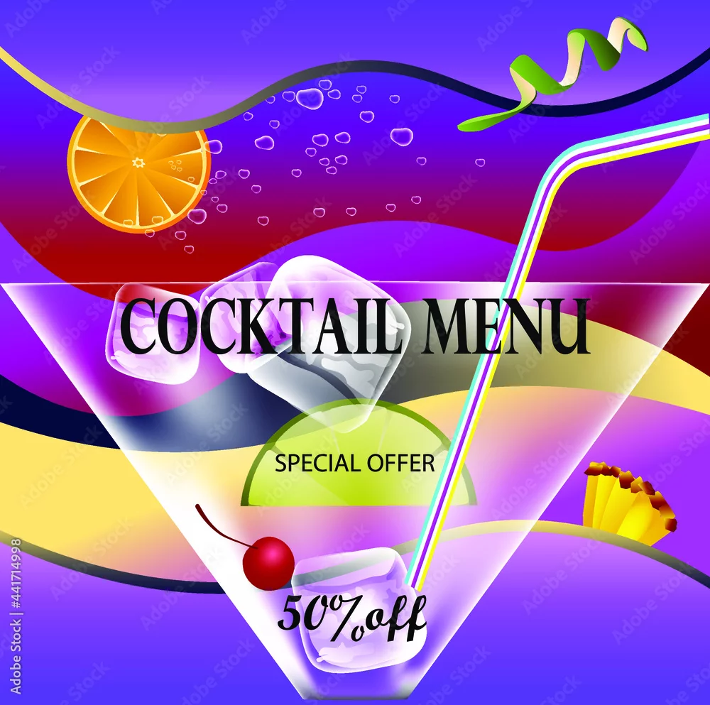 Cocktail menu design with a glass of martini and fruit. Fast food menu