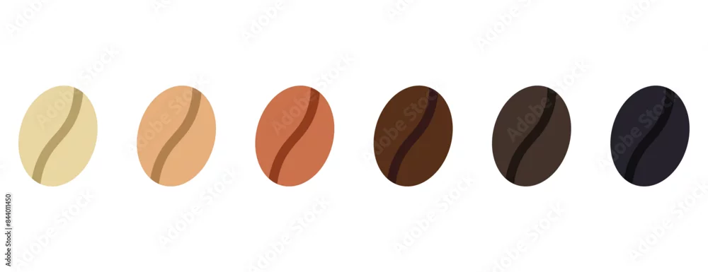 Coffee strength scale, different colour beans to show intensity or roast, vector illustration isolated on white background. Coffee beans showing various stage of roasting.