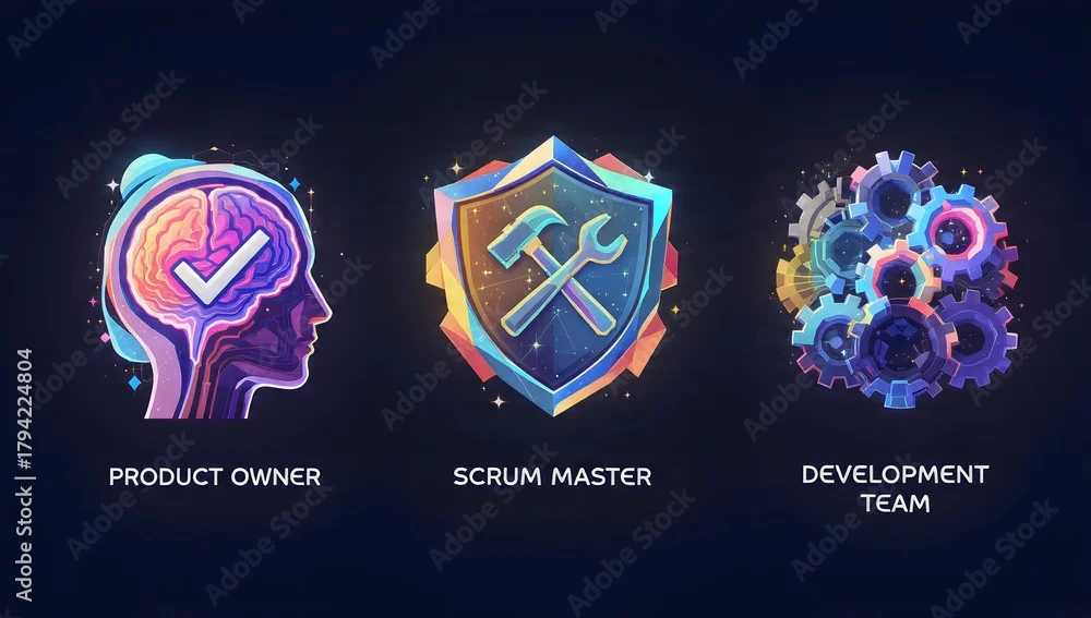 Collaborative Agile Roles: Product Owner, Scrum Master and Development Team depicted in a dynamic software project environment