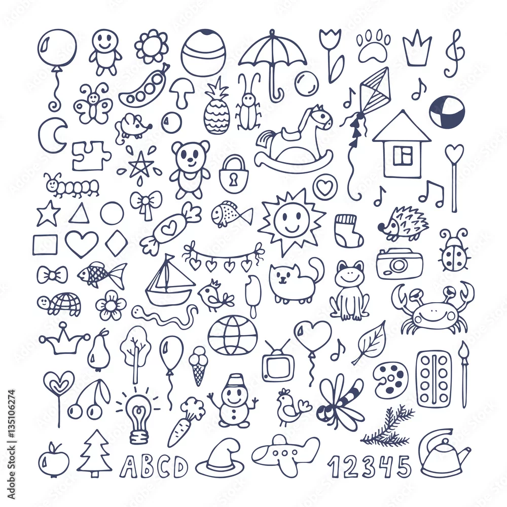 Collection of hand drawn cute doodles. Doodle children drawing.