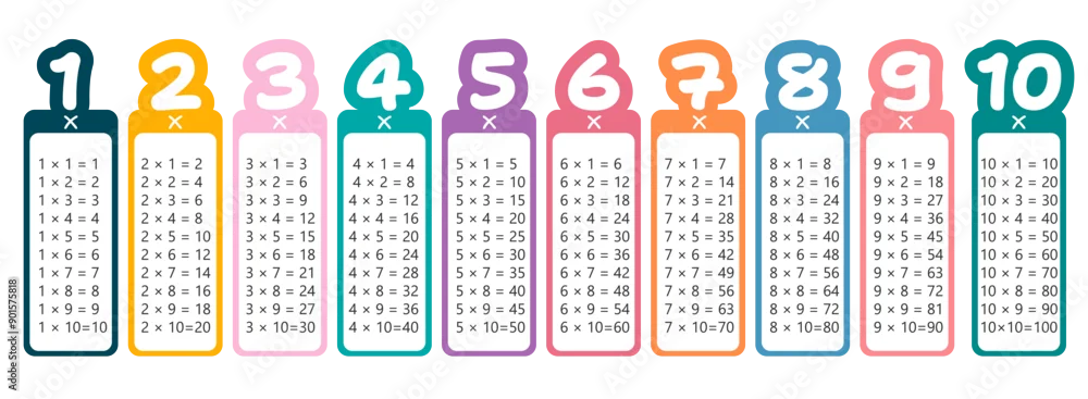 Colorful multiplication table between 1 to 10 as educational material for primary school level students isolated on a transparent background. Vector ...