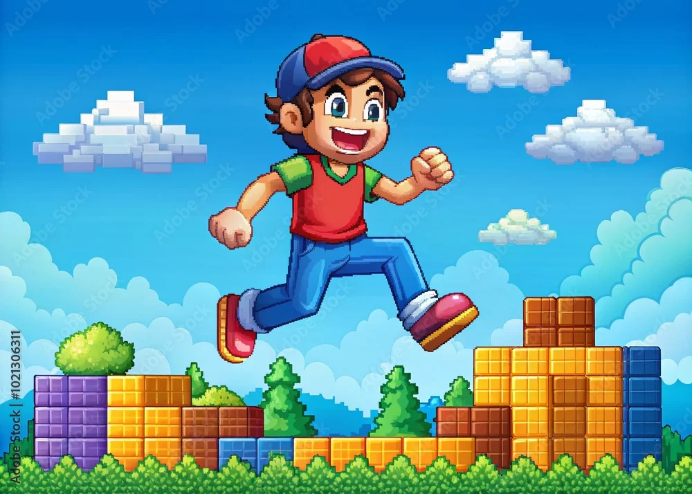 Colorful Retro Gaming Character Jumping Over Blocks in a Fun Pixel Art World for Video Game Enthusiasts and