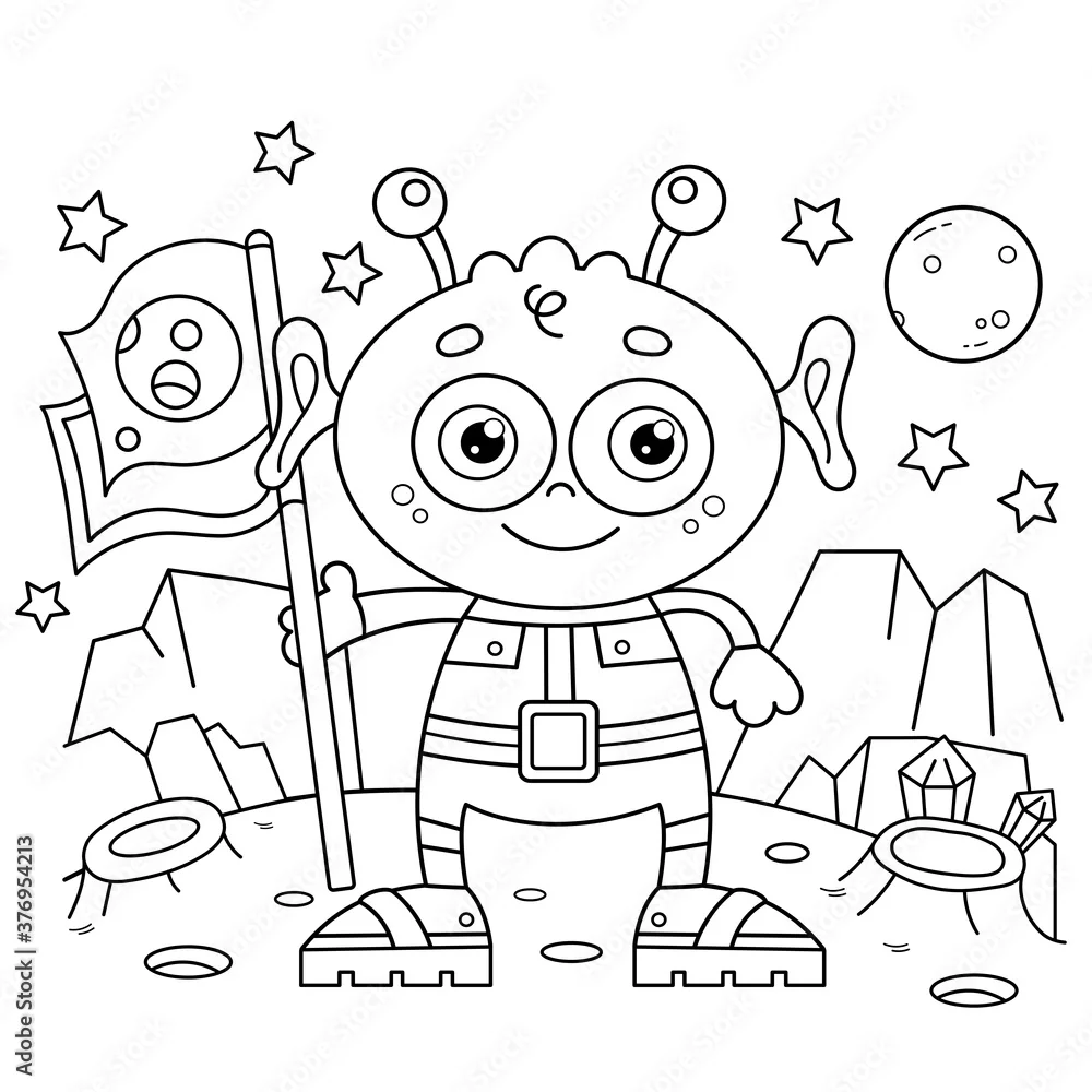 Coloring Page Outline Of a cartoon little alien with flag on planet. Space. Coloring book for kids.