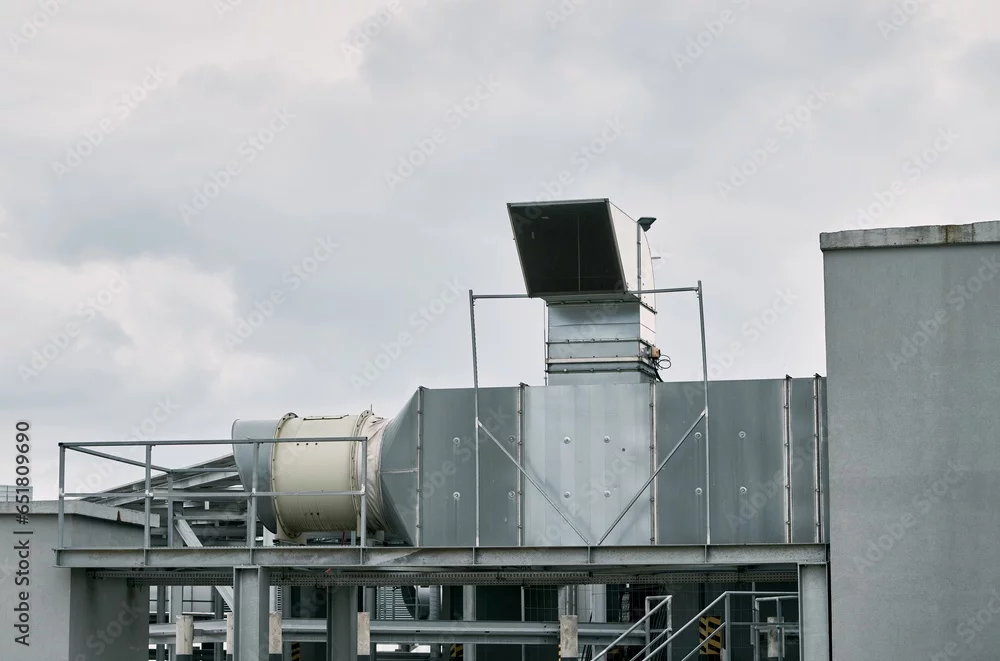 Commercial Pump HVAC. Condenser and compressor on the roof of the building. Big ventilation system. Unit of central air conditioner (AC) or heating ventilation air conditioning system