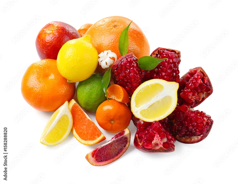 Composition of pomegranate and citrus fruits on white background