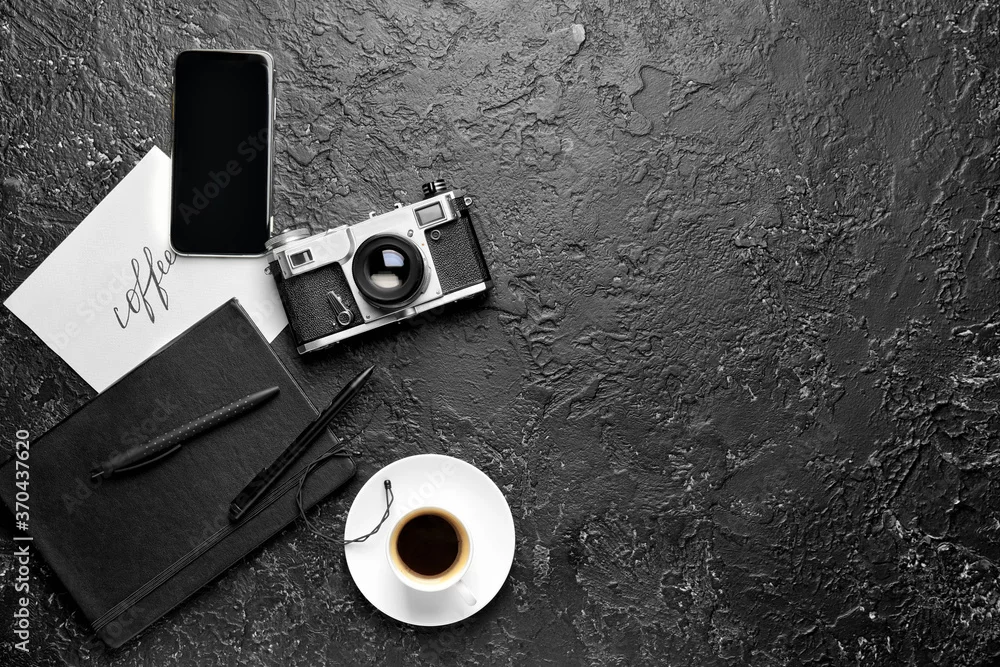 Composition with cup of coffee, photo camera and mobile phone on dark background
