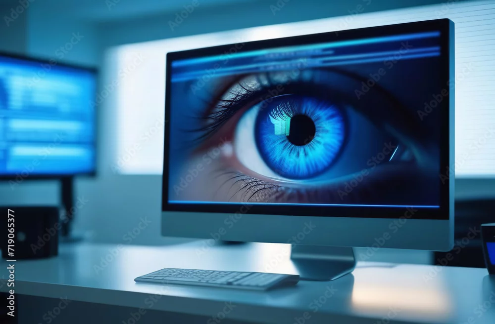 Computer Monitor with Blue Neon Eye on the Screen standing in the Modern Office or Clinic. Ophthalmology Creative Concept Idea. Technology. Biometric Eyes ...