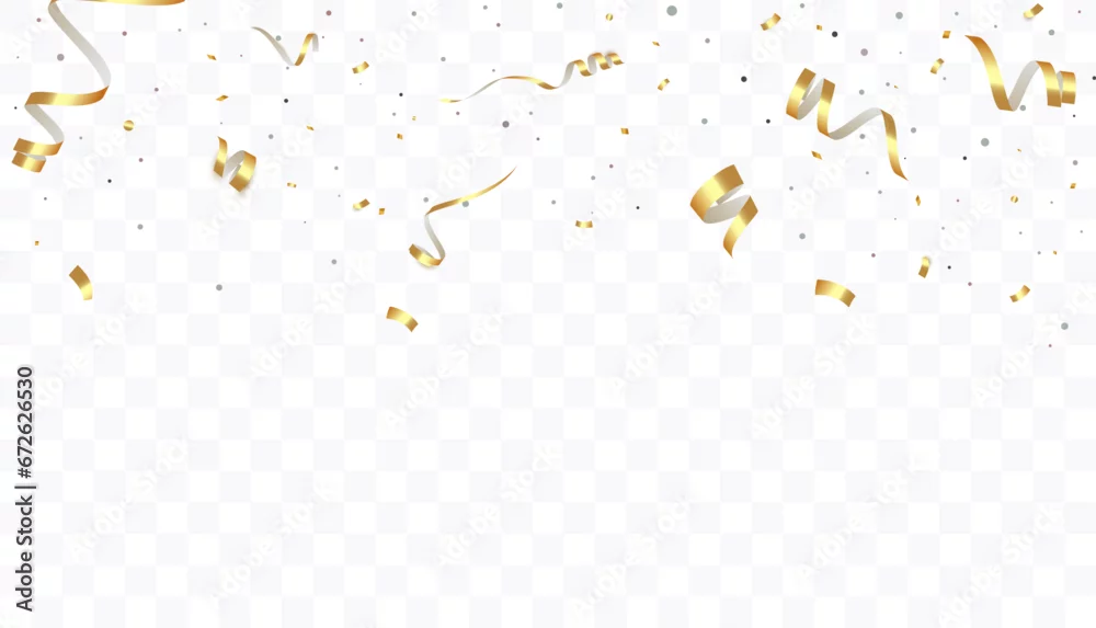 Confetti on a transparent background. Falling shiny golden confetti. Bright golden festive tinsel. Holiday design elements for web banner, poster, flyer, ...