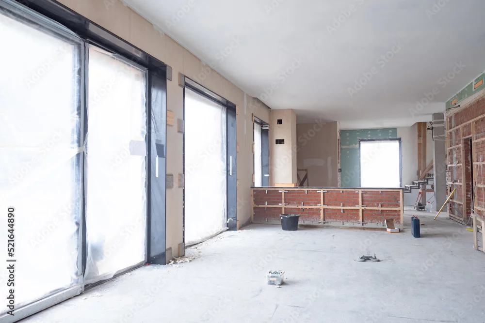 Construction works. Buildings under construction inside view. Final finishing work inside building. Windows renovated building are covered with foil. Spacious space under renovation. Unfinished house