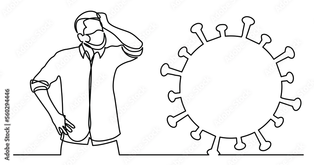 continuous line drawing of man in mask worrying about coronavirus threat - PNG image with transparent background