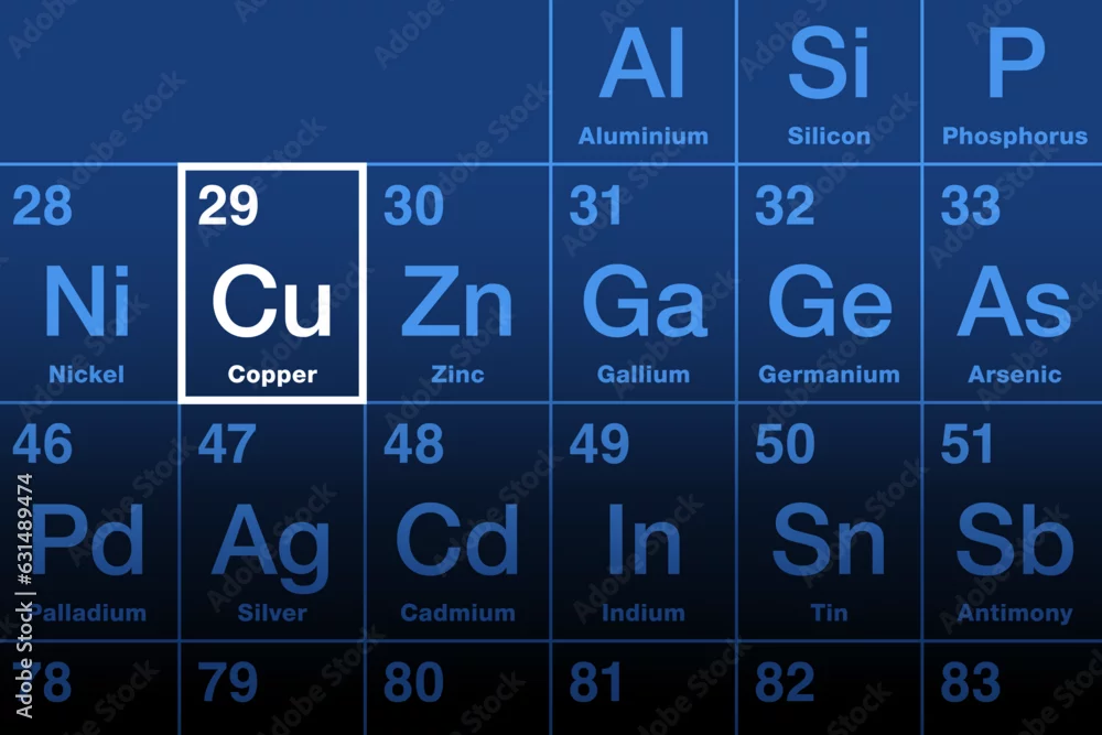Copper element on the periodic table, with element symbol Cu from Latin cuprum, and with atomic number 29. Transition metal with very high thermal and ...