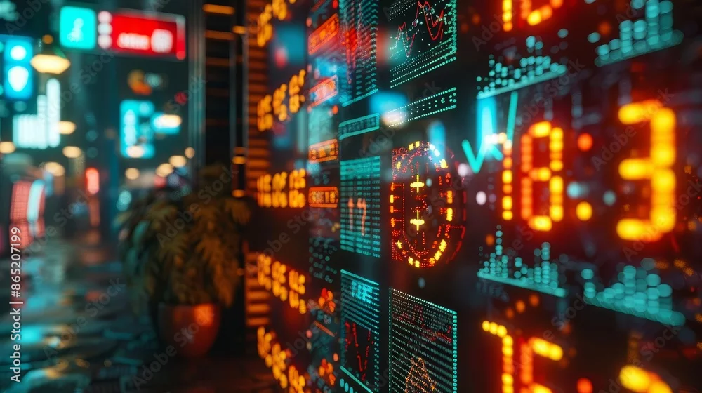 Corporate office wall adorned with illuminated financial symbols, including currency signs, stock exchange logos, and economic indicators