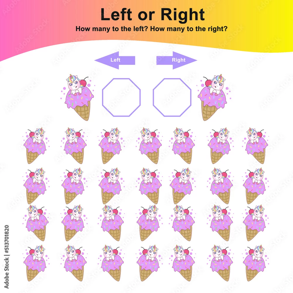 Counting unicorns left or right worksheet. Educational printable math worksheet. Vector illustration.