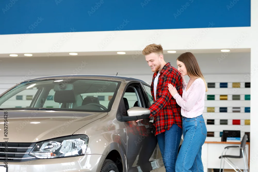 Couple choosing new car in salon