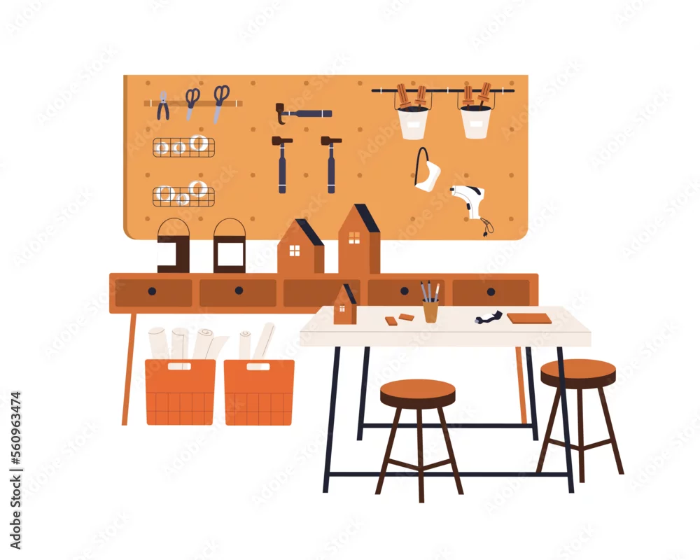 Crafts classroom, woodwork studio. School carpentry workshop with wood works, supplies, tools. Empty class room interior for joinery study. Flat vector illustration isolated on white background