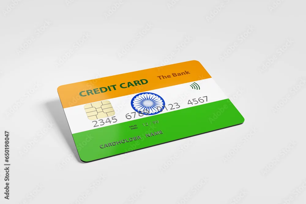 Credit card showing the national flag of India on white background. Illustration of the concept of Indian consumer behaviour and credit card issues