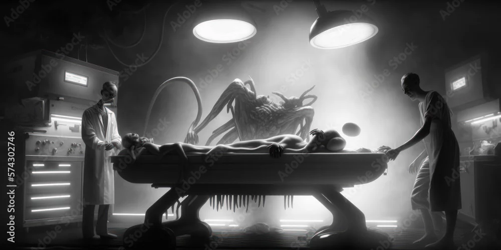Creepy black-and-white view of doctors performing an alien autopsy in a dystopian operating room. A larger alien observes.
