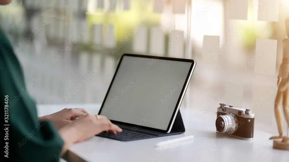 Cropped shot of female designer typing on blank screen tablet in simple co working space