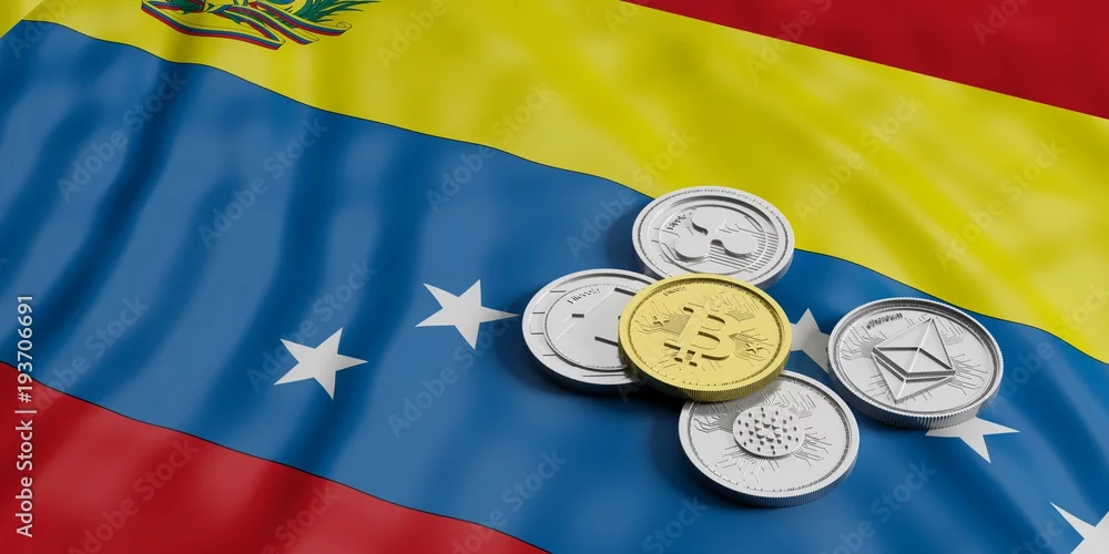 Cryptocurrency in Venezuela. Golden bitcoin and variety of silver virtual coins on Venezuela flag background. 3d illustration