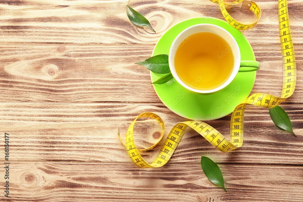 Cup of tea and measuring tape on wooden table. Weight loss concept