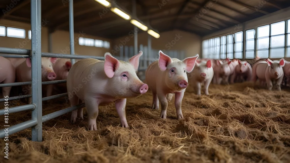 Curious pigs in Pig Breeding farm in swine business in tidy and clean indoor housing farm, with pig mother feeding piglet.