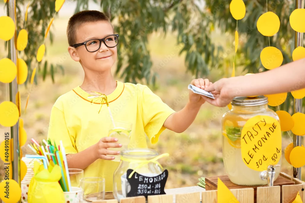 Cute boy selling lemonade in park