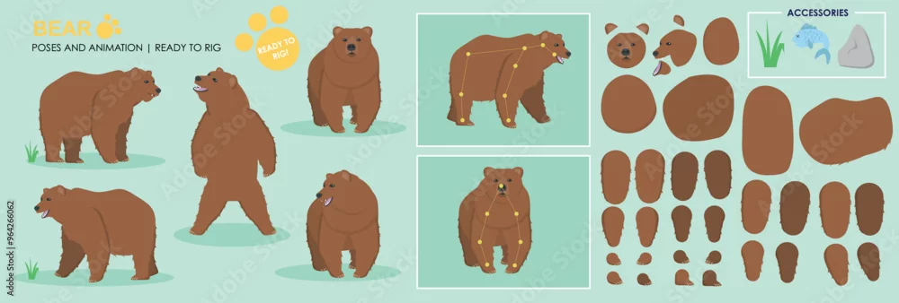 Cute brown bear ready for animation rigging , multiple poses, collection multiple angles including accessories, cartoon teddy bear character vector p ...